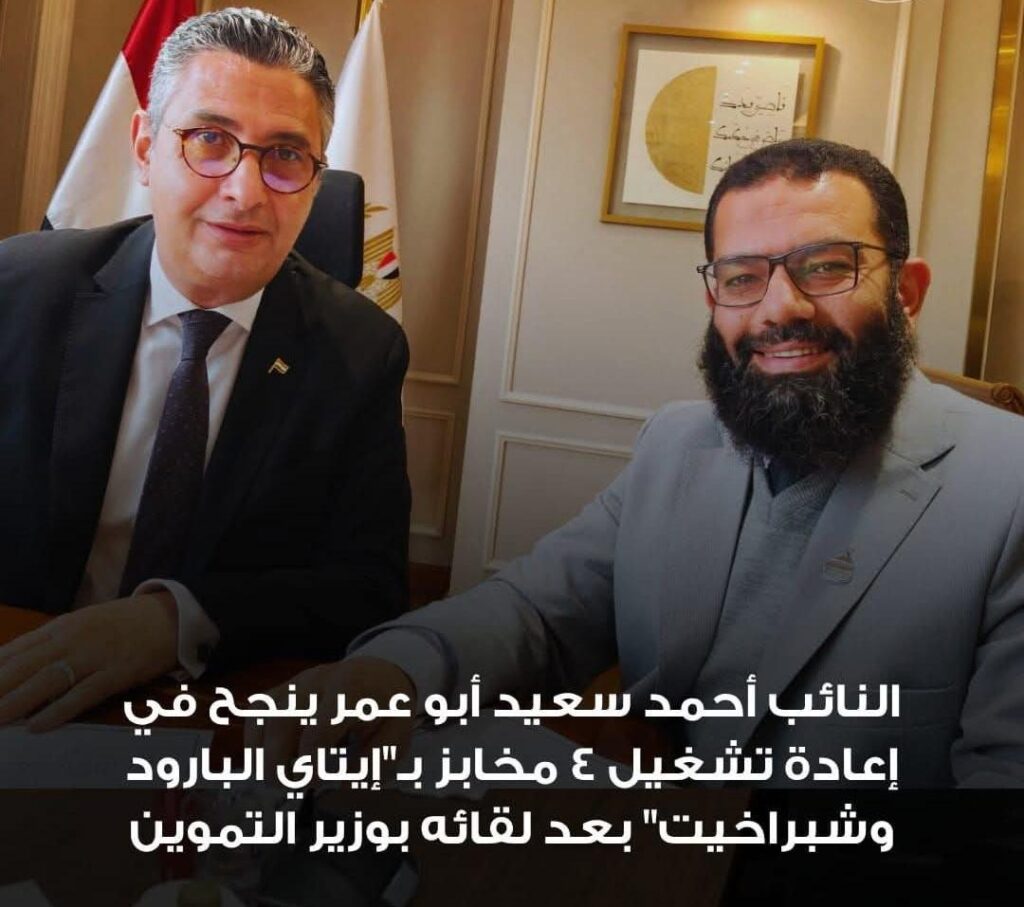 بقلم أحمد عماد أبو سويدجهود برلمانية تكلل بالنجاح لتوفير الخبز المدعم بقرى البحيرةفي إطار السعي المستمر لتخفيف الأعباء عن كاهل المواطنين وتلبية احتياجاتهم الأساسية، نجح النائب أحمد سعيد أبو عمر، عضو مجلس النواب عن دائرة (إيتاي البارود وشبراخيت)، في انتزاع موافقة رسمية لإعادة تشغيل 4 مخابز كانت متوقفة عن العمل، وذلك عقب لقاء مثمر جمعه مع السيد الدكتور شريف فاروق، وزير التموين والتجارة الداخلية.تحرك سريع لإنهاء أزمة نقص الخبزجاء هذا التحرك البرلماني استجابةً فورية لشكاوى أهالي القرى المتضررة من توقف الحصص التموينية الناتجة عن إغلاق هذه المخابز. وخلال الاجتماع، استعرض النائب أبعاد الأزمة في الدائرة، مؤكداً على ضرورة توفير رغيف الخبز المدعم بجودة عالية وضمان وصوله إلى مستحقيه دون عناء.خريطة المخابز العائدة للعملأسفرت النقاشات عن صدور موافقات فورية بإعادة تشغيل المخابز الأربعة في المناطق التالية:قرية معنية: إعادة تشغيل المخبز لخدمة أهالي القرية والمناطق المجاورة.منشية الرزافة (مركز شبراخيت): عودة العمل بالمخبز لإنهاء تكدس المواطنين.مدينة إيتاي البارود: تشغيل المخبز الحيوي داخل المدينة.قرية كفر الشيخ مخلوف: تلبية احتياجات المواطنين من الخبز البلدي المدعم.رسالة حاسمة لأصحاب المخابز: القانون فوق الجميعوفي تصريح له، شدد النائب أحمد سعيد أبو عمر على أن هذه الخطوة تهدف في المقام الأول لضمان “الأمن الغذائي” للمواطن البسيط. كما وجه رسالة تحذيرية واضحة لأصحاب المخابز العائدة للعمل، معتبراً هذه الموافقة “فرصة لتصحيح الأوضاع”.وأكد النائب أنه لن يتم التهاون مع أي تقصير مستقبلاً، حيث سيتم تطبيق القانون بحزم ضد المخالفين، مع تشديد العقوبات والغرامات لضمان التزام المخابز بالوزن والجودة والمواصفات المقررة من وزارة التموين.
